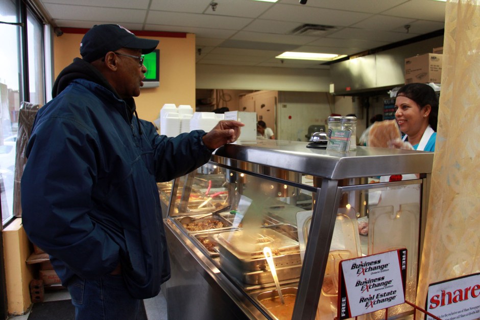 A Mona’s Roti staff member engages with a customer grabbing a lunch roti to go.