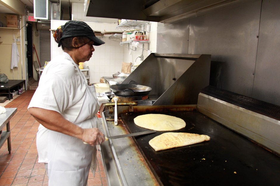 A chef at Ali’s West Indian Roti Shop makes paratha on a flat-top stove.