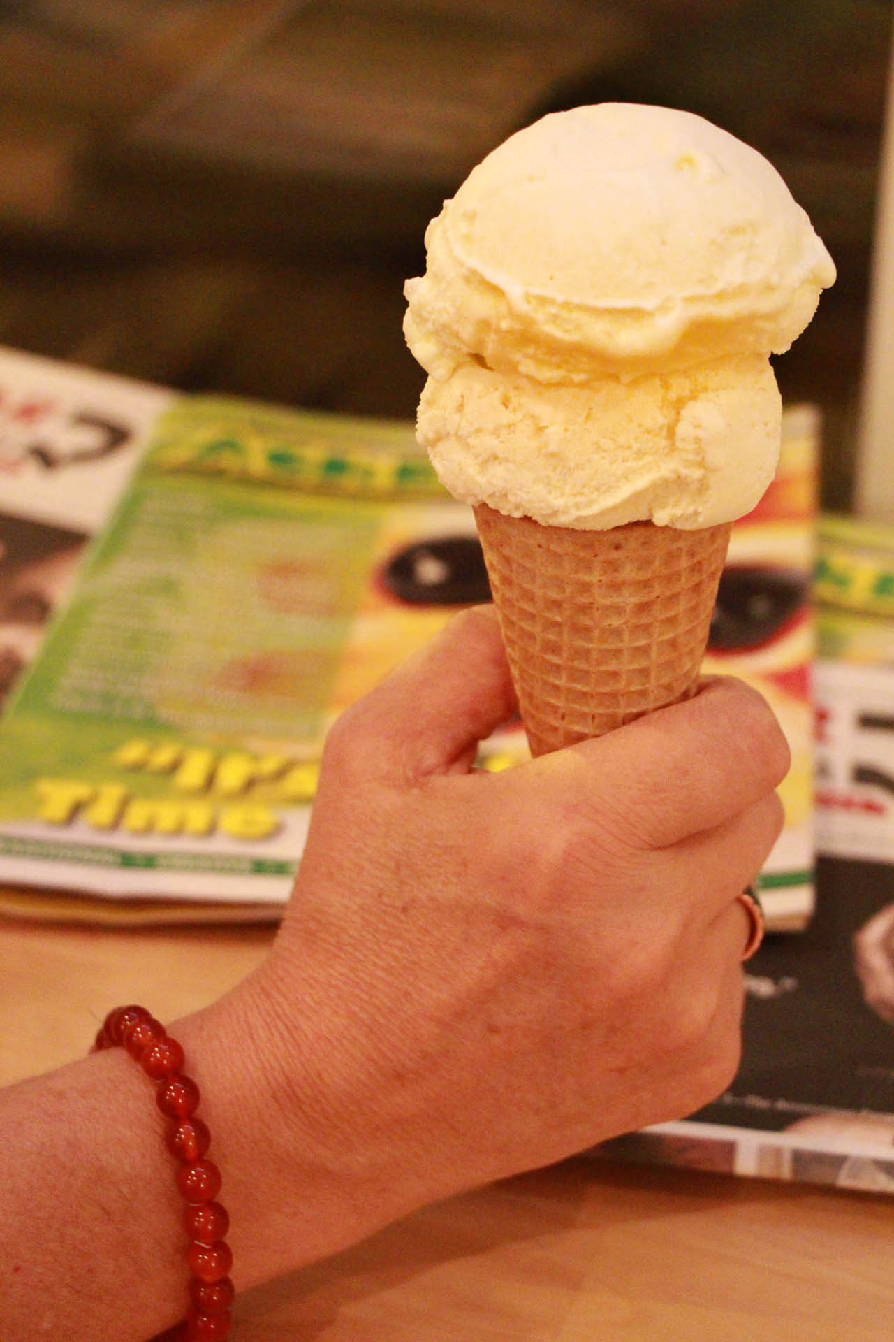 Rum Raisin on a waffle cone from JR Sweet’s Jamaica Inspired Ice Cream.